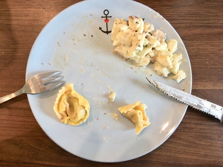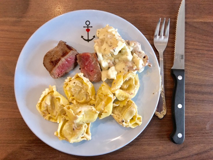 Da ich sehr gerne Fleisch esse und genau diese Tortellini nur ganz knapp dahinter auf meinem Wunschzettel stehen, war die Reihenfolge nun erst Fleisch, dann Tortellini und dann erst fast gar nichts vom Eiersalat.