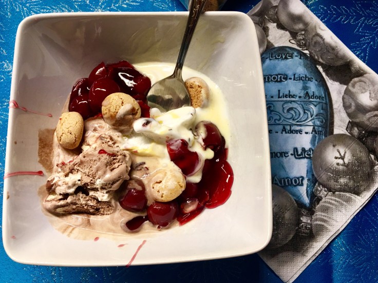 Vanilleeis mit heißen Kirschen und Amarettoplätzchen (muss man nicht viel kauen und EIS „geht doch fast immer noch rein“ 😉