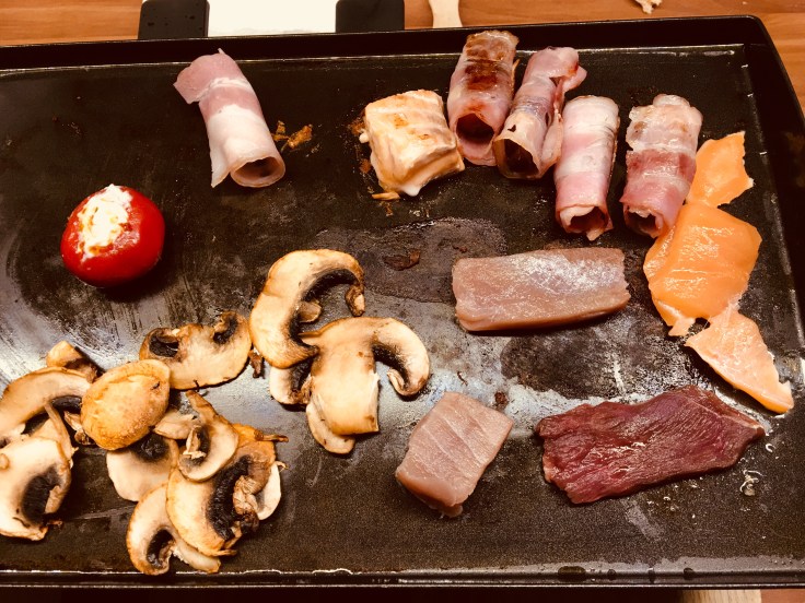 Lachs, Känguru-Steak, Rinderfilet, Gambas, frischer Thunfisch, Pilze, Datteln im Speckmantel und kleine gefüllte Paprikas kamen auf die heisse Grillplatte oben drauf.