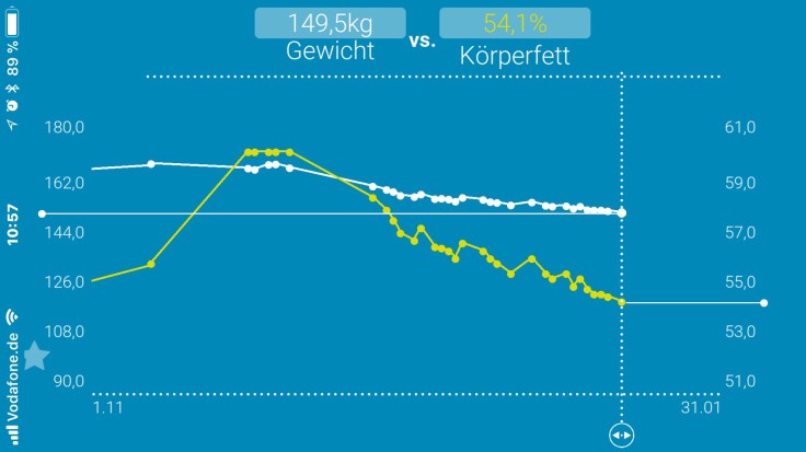 Die Veränderung sehe ich aktuell selbst am krassesten, nicht wirklich auf der Waage in Kilos, eher am Körperfettanteil, den meine Waage auch jedes Mal dokumentiert (seht die gelbe Kurve).
